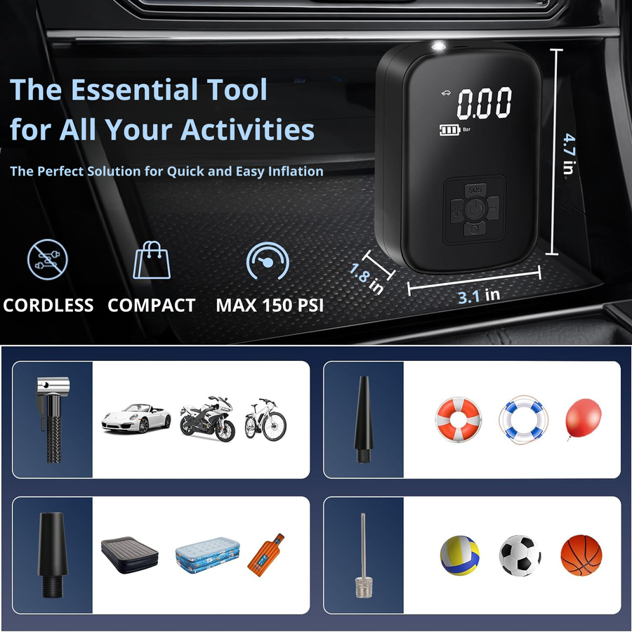 Our electric air pump, equipped with interchangeable nozzles, makes inflation quick and effortless—whether for your tires, sports balls, air mattresses, inflatable toys, water gear, and more. Compact and portable, it also features a built-in LED light for use day or night.