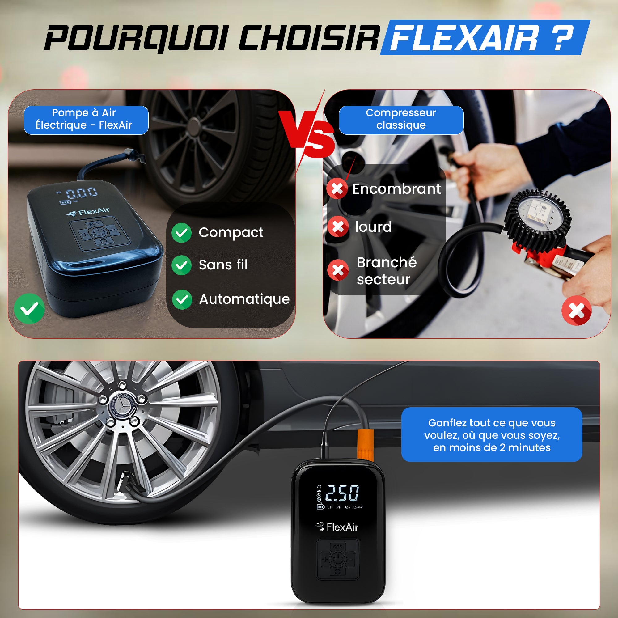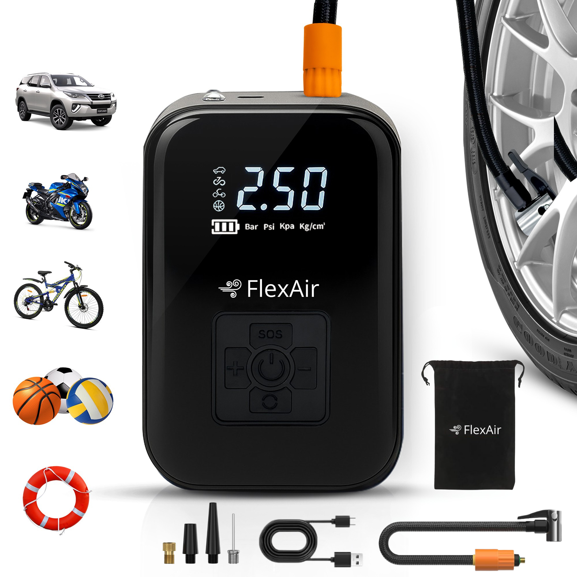 Our FlexAir electric pump has a long battery life. With a single battery charge, it can inflate between 5 and 6 fully deflated mid-size car tyres from 0 to 2.5 bar. This gives you great flexibility, whether on or off the road.